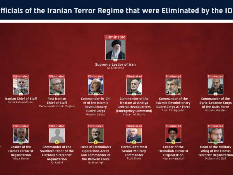 του Χασάν Νασράλα, ηγέτη της τρομοκρατικής οργάνωσης Χεζμπολάχ, μαζί με την πλειοψηφία της ανώτερης ηγεσίας της Χεζμπολάχ, τον Γιαχία Σινουάρ, ηγέτη της τρομοκρατικής οργάνωσης Χαμάς, Μοχάμεντ Ντέιφ, Διοικητή της Στρατιωτικής Πτέρυγας της Χαμάς, καθώς και την πλειοψηφία της ηγεσίας της Στρατιωτικής Πτέρυγας της Χαμάς, τον Μουχάμαντ αλ-Γκαμάρι, Αρχηγό του Γενικού Επιτελείου του τρομοκρατικού καθεστώτος των Χούθι, μιας σειράς ανώτερων διοικητών στην ιρανική αμυντική ηγεσία, συμπεριλαμβανομένου του Γκολάμ Αλί Ρασίντ, διοικητή του Κεντρικού Αρχηγείου Χατάμ-αλ Ανμπίγια, του Μοχάμεντ Μπαγκέρι, Αρχηγού του Επιτελείου των Ιρανικών Ενόπλων Δυνάμεων, και του Χοσεΐν Σαλαμί, διοικητή του Φρουρού της Επανάστασης, και άλλων αξιωματούχων.