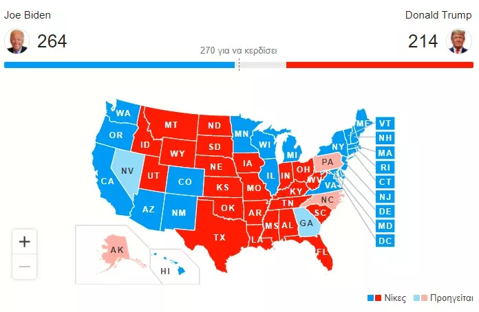 Στη Νεβάδα, με καταμετρημένο το 84% των ψήφων, ο Μπάιντεν προηγείται με 49,4% έναντι 48,5% του Τραμπ. Στη Βόρεια Καρολίνα, με καταμετρημένο το 94% των ψήφων, ο Τραμπ προηγείται με 50,1% έναντι 48,7% του Μπάιντεν.