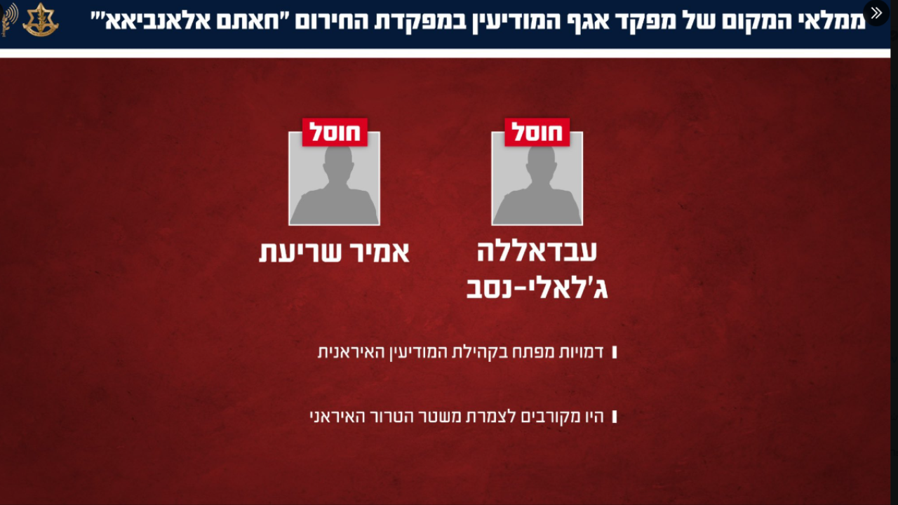 Σύμφωνα με τον ισραηλινό στρατό, νεκροί είναι ο Αμπντάλα Τζαλάλι Νασάμπ και ο Αμίρ Σαριάτ, οι οποίοι έδιναν τις κατευθύνσεις στην υπηρεσία Khatam al-Anbiya.