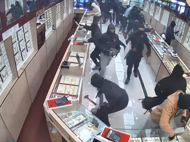 Οι επαγγελματίες κλέφτες έσπασαν τις γυάλινες βιτρίνες με πολύ μεγάλη ταχύτητα, έβαλαν χρυσό και διαμάντια στις τσάντες τους — αφαιρώντας περίπου το 75-80% των εμπορευμάτων του καταστήματος.