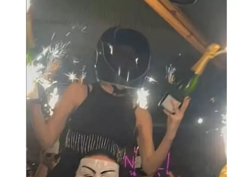 Σύμφωνα με φωτογραφίες και βίντεο, η νεαρή γυναίκα καθόταν στους ώμους συναδέλφου της, κρατώντας δύο μπουκάλια σαμπάνιας με σπινθηροβόλα, πριν η οροφή του μπαρ πιάσει φωτιά.