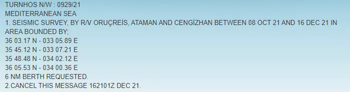 Σύμφωνα με τη Ναυτική Οδηγία που εξέδωσε η Τουρκία, το Ορούτς Ρέις, μαζί με τα πλοία που το συνοδεύουν, Αταμάν και Τζενγκίζ Χαν, θα πραγματοποιήσει σεισμικές έρευνες έως και τις 21 Δεκεμβρίου.