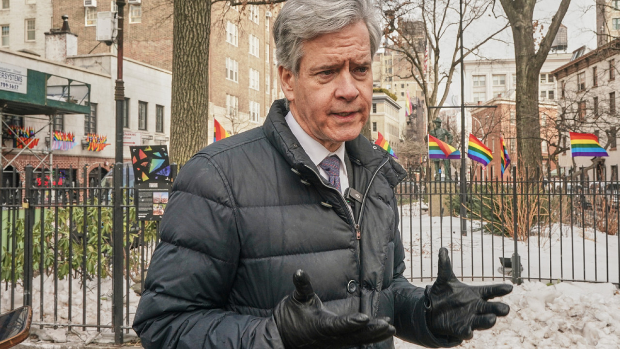 Κεντρική φωτογραφία: Ο πρόεδρος του δήμου του Μανχάταν, Μπραντ Χόιλμαν-Σίγκαλ, μιλάει στο Εθνικό Μνημείο Στόουνγουολ για το πώς η κυβέρνηση Τραμπ αφαίρεσε μια σημαία Pride με τα χρώματα του ουράνιου τόξου από το σημείο, Νέα Υόρκη, Τρίτη, 10 Φεβρουαρίου 2026.