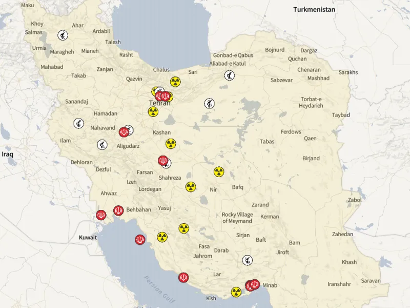 Συνολικά όλοι οι στόχοι σε έναν χάρτη: Επτά εγκαταστάσεις, πυρηνικές, στρατιωτικές και καθεστωτικές βρίσκονται έξω από την Τεχεράνη, ενώ οκτώ εγκαταστάσεις βρίσκονται κοντά στον Περσικό Κόλπο