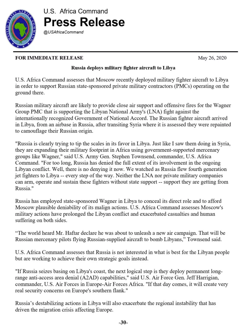Σύμφωνα με δελτίο τύπου που εξέδωσε το αρχηγείο των Αμερικανικών Ενόπλων Δυνάμεων στην Αφρική (US AFRICOM), η Ρωσία απέστειλε μαχητικά Mig29 και Sukhoi 24 στη Λιβύη για να βοηθήσουν το στρατό του Χαφτάρ (LNA) στον πόλεμο με το στρατό του Σάρατζ (GNA).