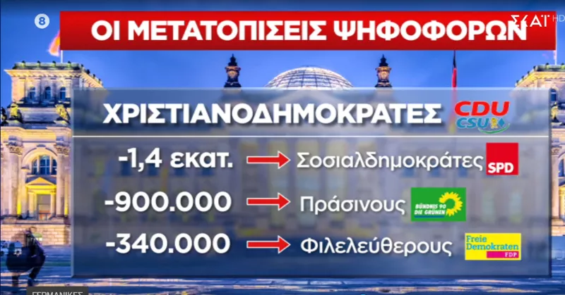 Η τηλεόραση του ΣΚΑΪ παρακολουθεί λεπτό προς λεπτό τις εξελίξεις και με έκτακτη εκπομπή αυτή την ώρα, με την Σία Κοσιώνη, τον Παύλο Τσίμα και τον Αλέξη Παπαχελά, θα σας ενημερώσει για τα αποτελέσματα των γερμανικών εκλογών.