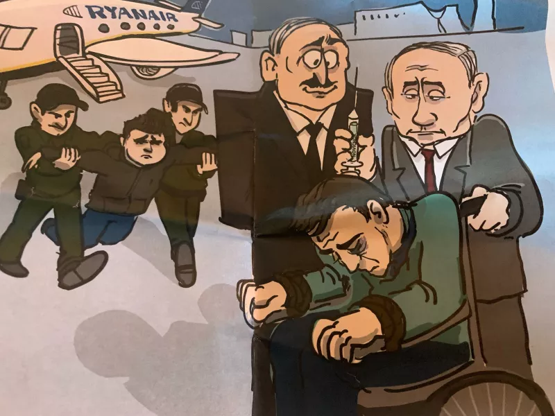 Ένα απίστευτο σκίτσο με τον Λευκορώσο δημοσιογράφο, Ρομάν Προτάσεβιτς, να βρίσκεται σε αναπηρικό αμαξίδιο και από πίσω του να είναι ο Ρώσος πρόεδρος, Βλάντιμιρ Πούτιν με μία σύριγγα στο χέρι αλλά και ο πρόεδρος της Λευκορωσίας, Αλεξάντερ Λουκασένκο, έξω από το αεροπλάνο από όπου απήχθη ο γνωστός δημοσιογράφος και ακτιβιστής, κάνει το γύρo του διαδικτύου.