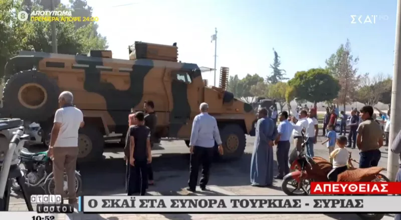 Η κάμερα του ΣΚΑΪ κατέγραψε ζωντανά το πέρασμα των μελών του ελεύθερου συριακού στρατού με αντιαεροπορικά και οπλοπολυβόλα από την συνοριακή γραμμή στο μέτωπο του πολέμου καθώς και την προέλαση των τουρκικών πολεμικών δυνάμεων και το σφυροκόπημα των τουρκικών πυροβολικών στους κουρδικούς στόχους.