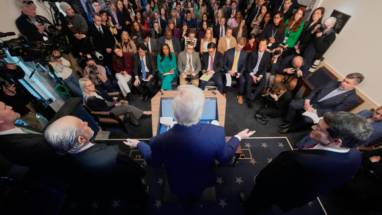 Έχοντας χαμηλωμένα τα φώτα στην αίθουσα ενημέρωσης του Λευκού Οίκου, επέπληξε δικαστές που ο ίδιος είχε διορίσει. Υποστήριξε ότι η απόφασή τους στην πραγματικότητα αποσαφήνισε τις ευρείες εξουσίες του να επιβάλλει δασμούς ή ακόμη και να διακόψει πλήρως τις εμπορικές σχέσεις με άλλες χώρες. Παρέθεσε επίσης απόσπασμα από μειοψηφούσα γνώμη του Ανωτάτου Δικαστηρίου, σύμφωνα με την οποία η απόφαση ενδέχεται να μην περιορίζει ουσιαστικά τη μελλοντική δυνατότητα ενός προέδρου να επιβάλλει δασμούς.