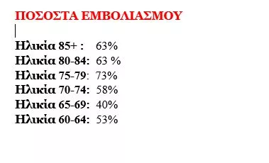 Προβληματισμό προκαλούν τα ποσοστά εμβολιασμού τωνμεγαλύτερων σε ηλικία: στους άνω των 80 το ποσοστό με μία δόση φτάνει το 63%, 73% στους 75 έως 79, το 58% στις ηλικίες 70 - 74, ενώ χαμηλότερα στις ηλικίες 60 έως 69.