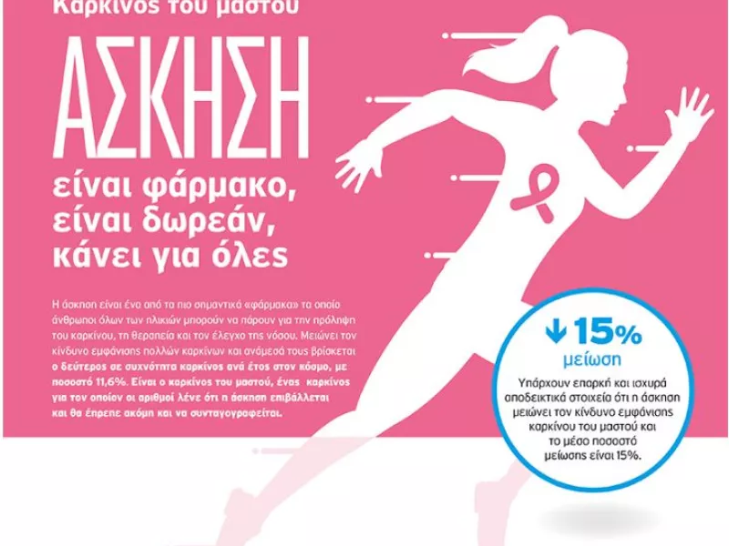 Η άσκηση είναι ένα από τα πιο σημαντικά «φάρμακα» τα οποία άνθρωποι όλων των ηλικιών και ικανοτήτων μπορούν να πάρουν για την πρόληψη του καρκίνου, τη θεραπεία και τον έλεγχο της νόσου. Μειώνει τον κίνδυνο εμφάνισης πολλών καρκίνων, ανάμεσα στους οποίους βρίσκεται και ο δεύτερος σε συχνότητα στο σύνολο, ανά έτος στον κόσμο, με ποσοστό 11,6%, ο καρκίνος του μαστού.