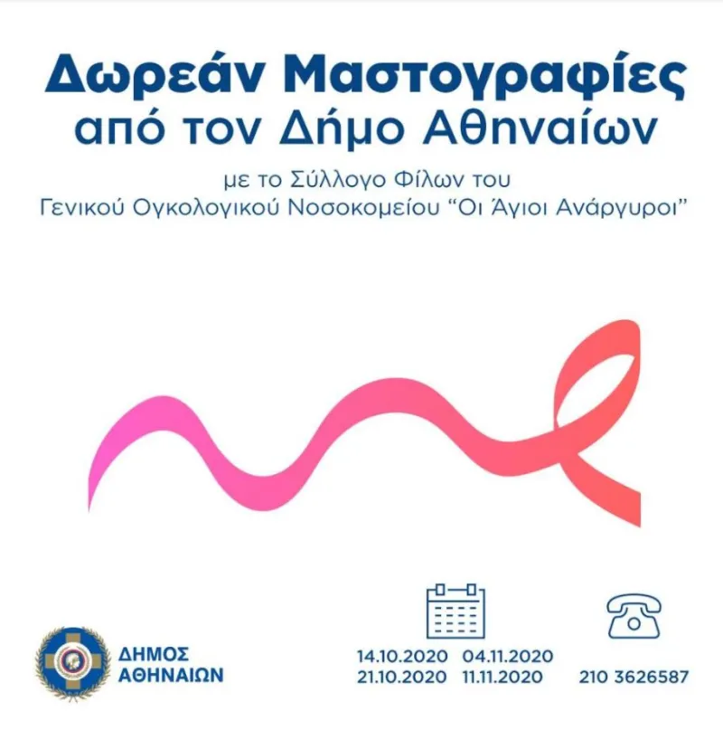 Ο Οκτώβριος έχει θεσμοθετηθεί από τον Παγκόσμιο Οργανισμό Υγείας ως ο «Μήνας Πρόληψης και Ενημέρωσης για τον καρκίνο του μαστού». Ο Δήμος Αθηναίων με την Διεύθυνση Δημοτικών Ιατρείων και Δημόσιας Υγείας, παρέχει δωρεάν μαστογραφικούς ελέγχους σε συνεργασία με το Σύλλογο Φίλων του Γενικού Ογκολογικού Νοσοκομείου “Οι Άγιοι Ανάργυροι” και με τη στήριξή του Εθνικού Διαδημοτικού Δικτύου Υγιών Πόλεων-Προαγωγής Υγείας.