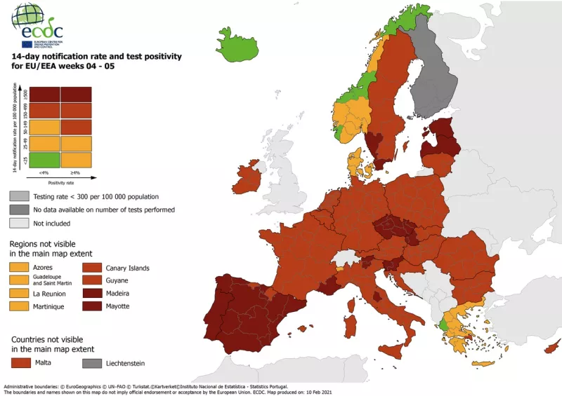 Η μοναδική περιοχή στην Ελλάδα που χρωματίζεται με «κόκκινο» χρώμα είναι πλέον η Αττική, που βρίσκεται σε απαγορευτικό, σύμφωνα με το Eυρωπαϊκό Κέντρο Πρόληψης και Ελέγχου Νόσων που δημοσίευσε τους αναθεωρημένους χάρτες που αποτυπώνουν την επιδημιολογική εικόνα στα κράτη-μέλη της ΕΕ. Ο χάρτης αφορά τον συνδυαστικό δείκτη τεστ, νέων κρουσμάτων και δείκτη θετικότητας για την περίοδο 4 έως 11 Φεβρουαρίου.