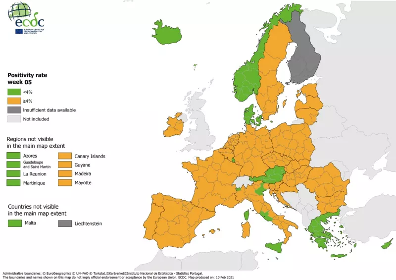 Όσον αφορά το δείκτη θετικότητας, η Ελλάδα παραμένει στο «πράσινο», την ώρα που οι περισσότερες χώρες της Ευρώπης βρίσκονται στο «κίτρινο». Δηλαδή, στο σύνολο της επικράτειας ο δείκτης θετικότητας βρίσκεται κάτω του ορίου συναγερμού του 4%, αντίθετα με την υπόλοιπη Ευρώπη, όπου ο δείκτης είναι μεγαλύτερος από 4.