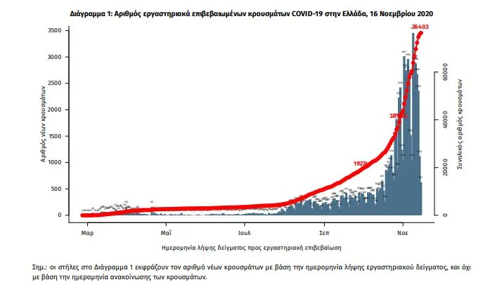 Τα στοιχεία που παρουσιάζονται αφορούν περιστατικά από την επιδημιολογική επιτήρηση της νόσου από το νέο κορωνοϊό (COVID19), με βάση τα δεδομένα που έχουν δηλωθεί στον ΕΟΔΥ και καταγραφεί μέχρι τις 16 Νοεμβρίου 2020 (ώρα 15:00).Τα νέα εργαστηριακά επιβεβαιωμένα κρούσματα της νόσου είναι 2198, εκ των οποίων 21 εντοπίστηκαν κατόπιν ελέγχων στις πύλες εισόδου της χώρας. Ο συνολικός αριθμός των κρουσμάτων ανέρχεται σε 76403 (ημερήσια μεταβολή +3.0%), εκ των οποίων 53.9% άνδρες. Οι νέοι θάνατοι ασθενών με COVID-19 είναι 59, ενώ από την έναρξη της επιδημίας έχουν καταγραφεί συνολικά 1165 θάνατοι.Η διάμεση ηλικία των ασθενών που απεβίωσαν είναι 80 έτη. Ο αριθμός των ασθενών που νοσηλεύονται διασωληνωμένοι