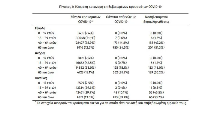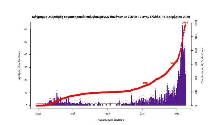 Τέλος, έχουμε 59 ακόμα καταγεγραμμένους θανάτους και 1165 θανάτους συνολικά στη χώρα. 473 (40.6%) γυναίκες και οι υπόλοιποι άνδρες. Η διάμεση ηλικία των θανόντων συμπολιτών μας ήταν τα 80 έτη και το 97.2% είχε κάποιο υποκείμενο νόσημα ή/και ηλικία 70 ετών και άνω.