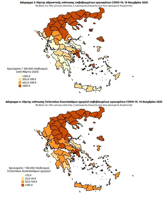 Ο χάρτης αποτυπώνει τη γεωγραφική κατανομή των συνολικών κρουσμάτων COVID-19 (από την αρχή της επιδημίας) ανά Περιφερειακή Ενότητα της χώρας, με βάση την δηλωθείσα διεύθυνση μόνιμης κατοικίας του ασθενούς, ή τη διεύθυνση προσωρινής διαμονής για τους τουρίστες και άλλους προσωρινά διαμένοντες στην Ελλάδα. Συμπεριλαμβάνονται τόσο κρούσματα με ιστορικό ταξιδίου (“εισαγόμενα”) όσο και κρούσματα με πιθανή εγχώρια μετάδοση.