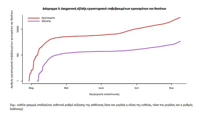 Η διαχρονική εξέλιξη των συνολικών κρουσμάτων και συνολικού αριθμού των θανάτων ασθενών COVID-19 παρουσιάζεται στο ακόλουθο διάγραμμα (σε λογαριθμική κλίμακα).