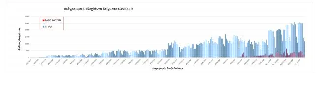 Δείγματα που έχουν ελεγχθεί: Από την 1η Ιανουαρίου 2020 μέχρι σήμερα, στα εργαστήρια που διενεργούν ελέγχους για τον νέο κορωνοϊό (SARS-CoV-2) και που δηλώνουν συστηματικά στον ΕΟΔΥ το σύνολο των δειγμάτων που ελέγχουν, έχουν συνολικά ελεγχθεί 2104235 κλινικά δείγματα ενώ από Μονάδες Υγείας και Κλιμάκια του ΕΟΔΥ που διενεργούν ελέγχους Rapid Ag έχουν ελεγχθεί 113653 δείγματα.