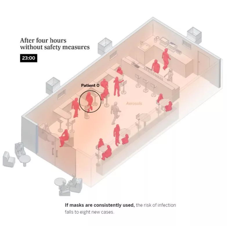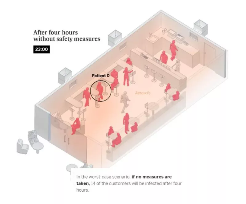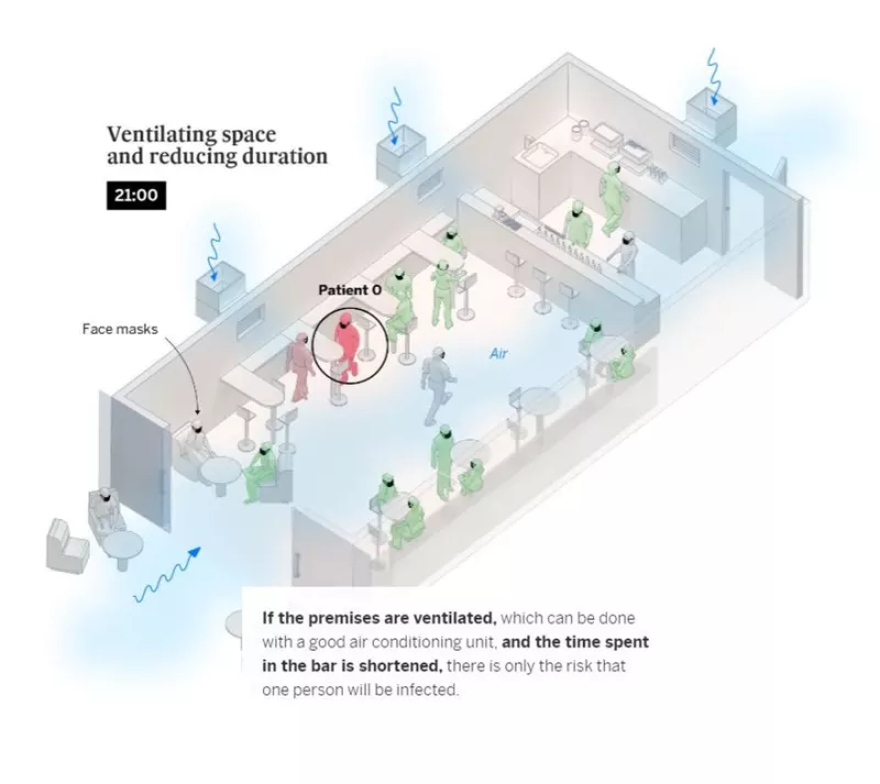 Η χωρητικότητα του μπαρ είναι μειωμένη στο 50%, υπάρχουν 15 πελάτες και τρεις εργαζόμενοι, τα παράθυρα είναι κλειστά και δεν υπάρχει εξαερισμός. Μετά από έξι ώρες χωρίς μέτρα ασφαλείας 14 από τους πελάτες θα μολυνθούν: