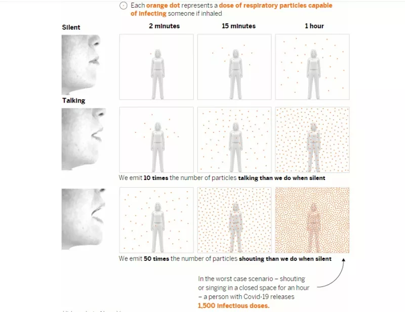Κάθε πορτοκαλί κουκκίδα αντιπροσωπεύει μια δόση αναπνευστικών σωματιδίων ικανών να μολύνουν κάποιον σε περίπτωση εισπνοής. Στο χειρότερο σενάριο φωνάζοντας ή τραγουδώντας σε κλειστό χώρο για μια ώρα, ένα άτομο με Covid-19 απελευθερώνει 1500 μολυσματικές δόσεις: