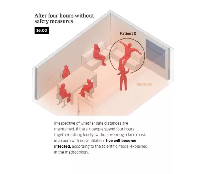 Αναφορικά με το δωμάτιο, το σενάριο περιλαμβάνει έξι άτομα που βρίσκονται στο ίδιο δωμάτιο με τον έναν εξ αυτών να είναι θετικός στον κορωνοϊό καθώς στην Ισπανία υπολογίζεται ότι το 31% των μολύνσεων, έγιναν μέσω αυτού του τρόπου ανάμεσα σε συγγενείς και φίλους. Μετά από τέσσερις ώρες και εάν κανείς από τους πέντε υγιείς δεν φοράει μάσκα και εάν δεν υπάρχει εξαερισμός, θα ασθενήσουν και οι πέντε: