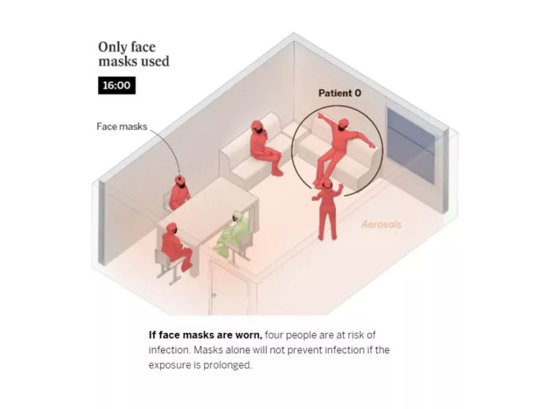 Αν στο ίδιο χρονικό διάστημα οι πέντε υγιείς φορούν μάσκα τότε οι τέσσερις αντιμετωπίζουν ακόμα τον κίνδυνο να νοσήσουν, καθώς αποκλειστικά οι μάσκες δεν επαρκούν εφόσον η έκθεση είναι παρατεταμένη: