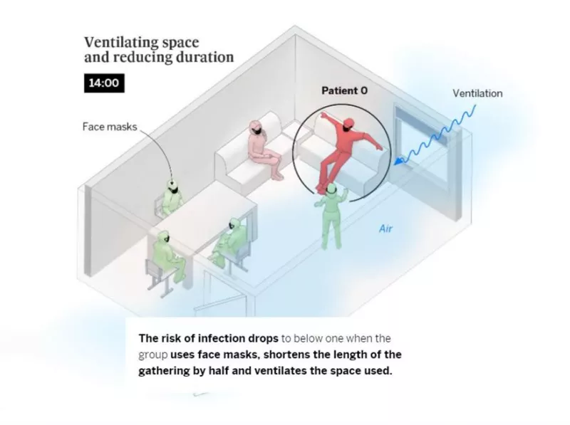 Αν υπάρχει ο συνδυασμός εξαερισμός, μάσκες και μικρότερη παραμονή στον κλειστό χώρο, τότε ο αριθμός των πιθανών κρουσμάτων μειώνεται μόλις στο ένα άτομο: