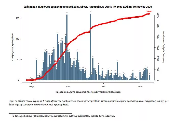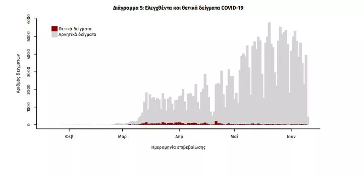 Από την 1η Ιανουαρίου 2020 μέχρι σήμερα, στα εργαστήρια που διενεργούν ελέγχους για τον νέο κορωνοϊό (SARS-CoV-2) και που δηλώνουν συστηματικά στον ΕΟΔΥ το σύνολο των δειγμάτων που ελέγχουν (θετικά και αρνητικά), έχουν συνολικά ελεγχθεί 240924 κλινικά δείγματα, εκ των οποίων τα 5058 (2.1%) ήταν θετικά στον κορωνοϊό (συμπεριλαμβάνονται και περισσότερα από ένα δείγματα ανά άτομο που ελέγχθηκε).
