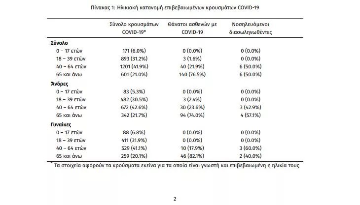 Η μέση ηλικία των κρουσμάτων είναι 47 έτη (εύρος 0 έως 102 ετών), ενώ η μέση ηλικία των θανάτων είναι 76 έτη (εύρος 35 έως 102 ετών). Η ηλικιακή κατανομή των (α) συνολικών κρουσμάτων, (β) των περιστατικών που κατέληξαν σε θάνατο και (γ) των ασθενών που νοσηλεύονται διασωληνωμένοι, είναι η ακόλουθη: