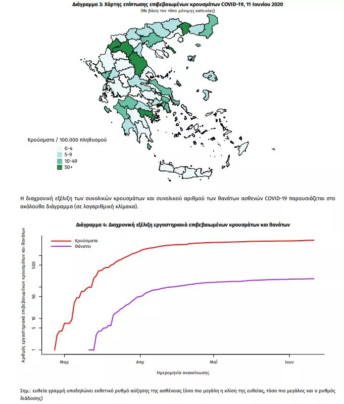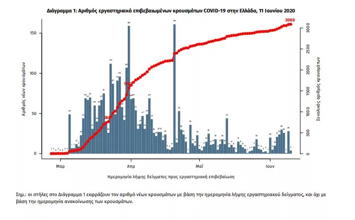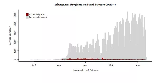 Από την 1η Ιανουαρίου 2020 μέχρι σήμερα, στα εργαστήρια που διενεργούν ελέγχους για τον νέο κορωνοϊό (SARS-CoV-2) και που δηλώνουν συστηματικά στον ΕΟΔΥ το σύνολο των δειγμάτων που ελέγχουν (θετικά και αρνητικά), έχουν συνολικά ελεγχθεί 237276 κλινικά δείγματα, εκ των οποίων τα 5062 (2.1%) ήταν θετικά στον κορωνοϊό (συμπεριλαμβάνονται και περισσότερα από ένα δείγματα ανά άτομο που ελέγχθηκε).