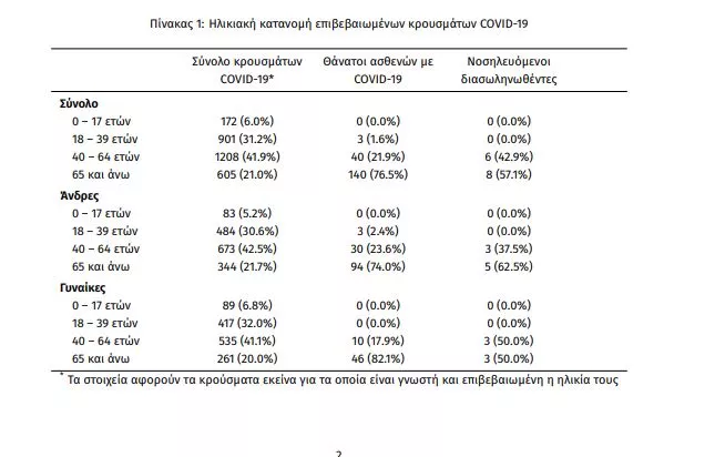 Η μέση ηλικία των κρουσμάτων είναι 47 έτη (εύρος 0 έως 102 ετών), ενώ η μέση ηλικία των θανάτων είναι 76 έτη (εύρος 35 έως 102 ετών). Η ηλικιακή κατανομή των (α) συνολικών κρουσμάτων, (β) των περιστατικών που κατέληξαν σε θάνατο και (γ) των ασθενών που νοσηλεύονται διασωληνωμένοι, είναι η ακόλουθη: