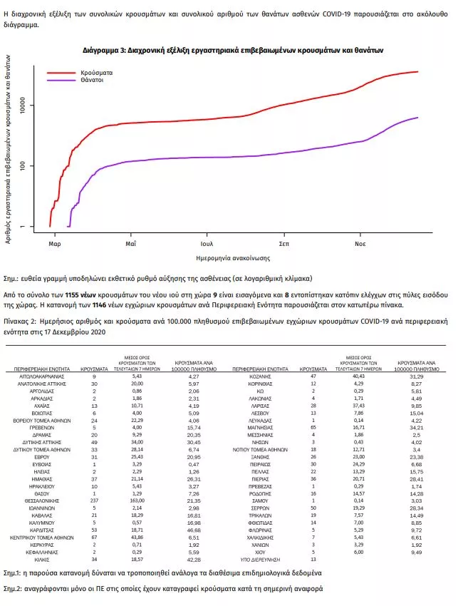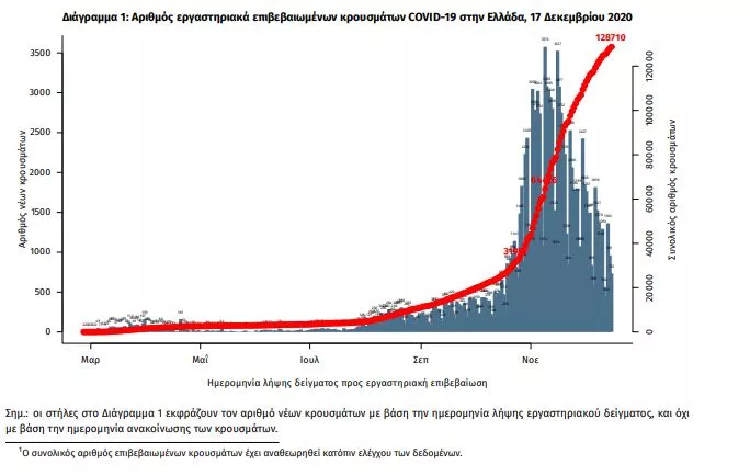 Τα στοιχεία που παρουσιάζονται αφορούν περιστατικά από την επιδημιολογική επιτήρηση της νόσου από το νέο κορωνοϊό (COVID19), με βάση τα δεδομένα που έχουν δηλωθεί στον ΕΟΔΥ και καταγραφεί μέχρι τις 17 Δεκεμβρίου 2020 (ώρα 15:00).Τα νέα εργαστηριακά επιβεβαιωμένα κρούσματα της νόσου είναι 1155, εκ των οποίων 8 εντοπίστηκαν κατόπιν ελέγχων στις πύλες εισόδου της χώρας. Ο συνολικός αριθμός των κρουσμάτων ανέρχεται σε 128710 (ημερήσια μεταβολή +0.9%), εκ των οποίων 52.5% άνδρες. 1 Οι νέοι θάνατοι ασθενών με COVID-19 είναι 78, ενώ από την έναρξη της επιδημίας έχουν καταγραφεί συνολικά 3948 θάνατο.Η διάμεση ηλικία των ασθενών που απεβίωσαν είναι 79 έτη. Ο αριθμός των ασθενών που νοσηλεύονται διασωληνωμένοι είναι 542 (69.6% άνδρες). Η ημερήσια κατανομή των επιβεβαιωμένων κρουσμάτων είναι η ακόλουθη (η γραμμή παριστάνει την συνολική, αθροιστική κατανομή των κρουσμάτων).