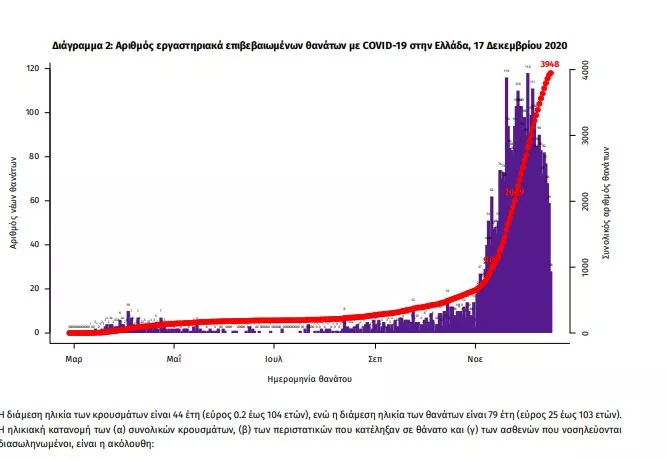 Τέλος, έχουμε 78 ακόμα καταγεγραμμένους θανάτους και 3948 θανάτους συνολικά στη χώρα. 1585 (40.1%) γυναίκες και οι υπόλοιποι άνδρες. Η διάμεση ηλικία των θανόντων συμπολιτών μας ήταν τα 79 έτη και το 95.6% είχε κάποιο υποκείμενο νόσημα ή/και ηλικία 70 ετών και άνω.