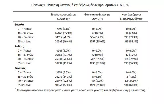 Η διάμεση ηλικία των κρουσμάτων είναι 44 έτη (εύρος 0.2 έως 104 ετών), ενώ η διάμεση ηλικία των θανάτων είναι 79 έτη (εύρος 25 έως 103 ετών). Η ηλικιακή κατανομή των (α) συνολικών κρουσμάτων, (β) των περιστατικών που κατέληξαν σε θάνατο και (γ) των ασθενών που νοσηλεύονται διασωληνωμένοι, είναι η ακόλουθη: