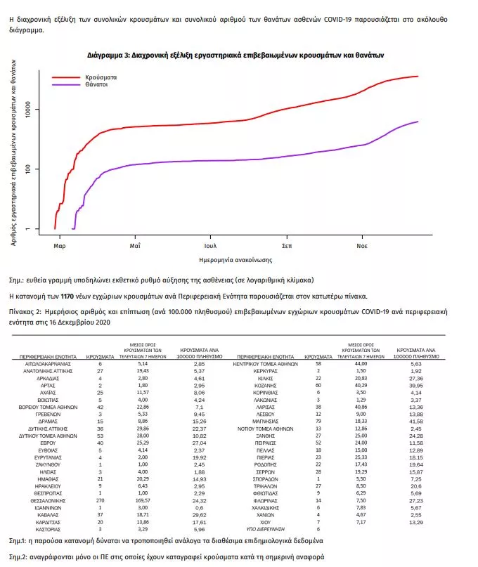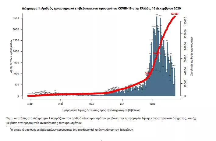 Τα στοιχεία που παρουσιάζονται αφορούν περιστατικά από την επιδημιολογική επιτήρηση της νόσου από το νέο κορωνοϊό (COVID19), με βάση τα δεδομένα που έχουν δηλωθεί στον ΕΟΔΥ και καταγραφεί μέχρι τις 16 Δεκεμβρίου 2020 (ώρα 15:00). Τα νέα εργαστηριακά επιβεβαιωμένα κρούσματα της νόσου είναι 1190, εκ των οποίων 17 εντοπίστηκαν κατόπιν ελέγχων στις πύλες εισόδου της χώρας. Ο συνολικός αριθμός των κρουσμάτων ανέρχεται σε 127557 (ημερήσια μεταβολή +0.9%), εκ των οποίων 52.5% άνδρες. 1 Οι νέοι θάνατοι ασθενών με COVID-19 είναι 85, ενώ από την έναρξη της επιδημίας έχουν καταγραφεί συνολικά 3870 θάνατοι.Η διάμεση ηλικία των ασθενών που απεβίωσαν είναι 79 έτη. Ο αριθμός των ασθενών που νοσηλεύονται διασωληνωμένοι είναι 552 (70.7% άνδρες). To 𝑅𝑡 για την επικράτεια στις 16 Δεκεμβρίου 2020 εκτιμάται σε 0.86 Η ημερήσια κατανομή των επιβεβαιωμένων κρουσμάτων είναι η ακόλουθη (η γραμμή παριστάνει την συνολική, αθροιστικήκατανομή των κρουσμάτων).
