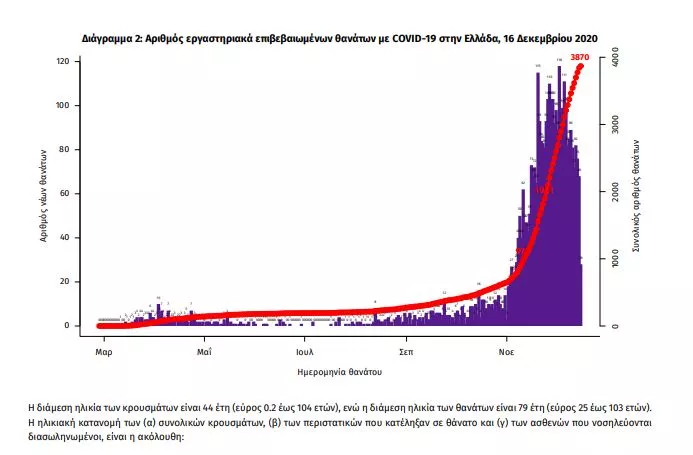 Τέλος, έχουμε 85 ακόμα καταγεγραμμένους θανάτους και 3870 θανάτους συνολικά στη χώρα. 1556 (40.2%) γυναίκες και οι υπόλοιποι άνδρες. Η διάμεση ηλικία των θανόντων συμπολιτών μας ήταν τα 79 έτη και το 95.6% είχε κάποιο υποκείμενο νόσημα ή/και ηλικία 70 ετών και άνω.