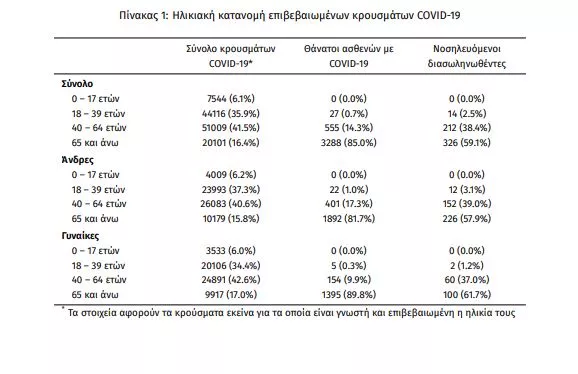 Η διάμεση ηλικία των κρουσμάτων είναι 44 έτη (εύρος 0.2 έως 104 ετών), ενώ η διάμεση ηλικία των θανάτων είναι 79 έτη (εύρος 25 έως 103 ετών). Η ηλικιακή κατανομή των (α) συνολικών κρουσμάτων, (β) των περιστατικών που κατέληξαν σε θάνατο και (γ) των ασθενών που νοσηλεύονται διασωληνωμένοι, είναι η ακόλουθη: