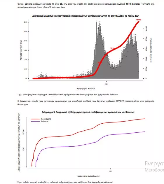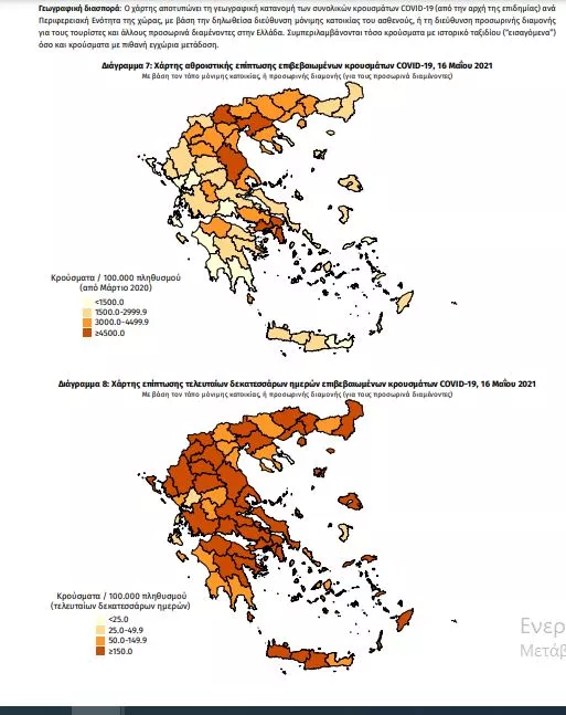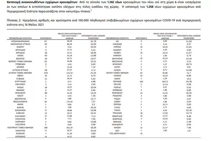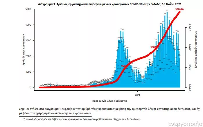 Τα στοιχεία που παρουσιάζονται αφορούν περιστατικά από την επιδημιολογική επιτήρηση της νόσου από το νέο κορωνοϊό (COVID19), με βάση τα δεδομένα που έχουν δηλωθεί στον ΕΟΔΥ και καταγραφεί μέχρι τις 16 Μαΐου 2021 (ώρα 15:00). Τα νέα εργαστηριακά επιβεβαιωμένα κρούσματα της νόσου που καταγράφηκαν τις τελευταίες 24 ώρες είναι 1.262, εκ των οποίων 4 εντοπίστηκαν κατόπιν ελέγχων στις πύλες εισόδου της χώρας. Ο συνολικός αριθμός των κρουσμάτων ανέρχεται σε 377.090 (ημερήσια μεταβολή +0.3%), εκ των οποίων 51.2% άνδρες. 1 Με βάση τα επιβεβαιωμένα κρούσματα των τελευταίων 7 ημερών, 40 θεωρούνται σχετιζόμενα με ταξίδι από το εξωτερικό και 2.711 είναι σχετιζόμενα με ήδη γνωστό κρούσμα. Ημερήσια εξέλιξη της πανδημίας: Η ημερήσια κατανομή των επιβεβαιωμένων κρουσμάτων είναι η ακόλουθη (η γραμμή παριστάνει την συνολική, αθροιστική κατανομή των κρουσμάτων).