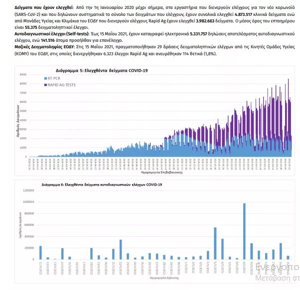 Τα νέα εργαστηριακά επιβεβαιωμένα κρούσματα της νόσου που καταγράφηκαν τις τελευταίες 24 ώρες είναι 1262 σε 23443 τεστ.