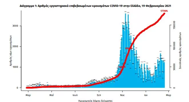 Τα νέα εργαστηριακά επιβεβαιωμένα κρούσματα της νόσου που καταγράφηκαν τις τελευταίες 24 ώρες είναι 1.460, εκ των οποίων 2 εντοπίστηκαν κατόπιν ελέγχων στις πύλες εισόδου της χώρας, σύμφωνα με τον ΕΟΔΥ.