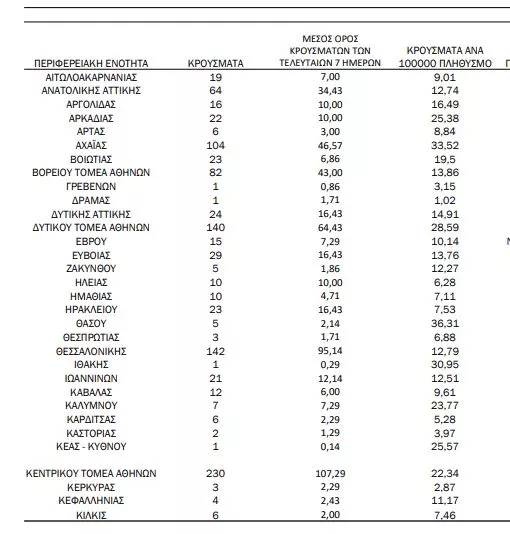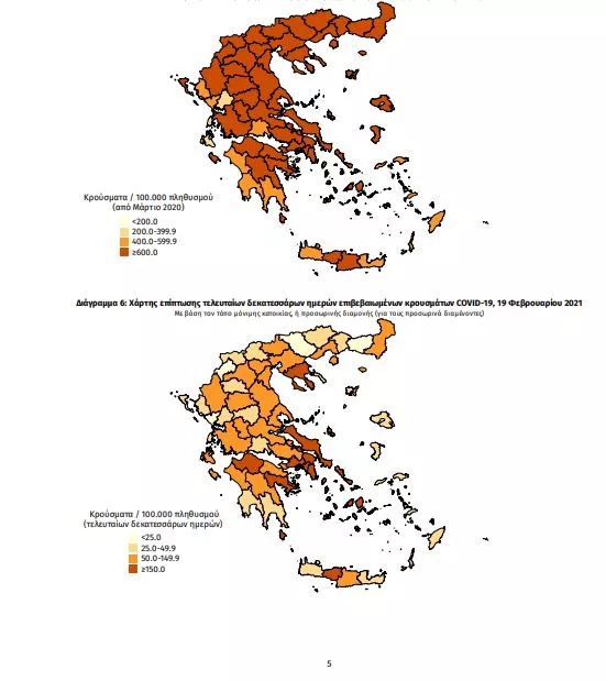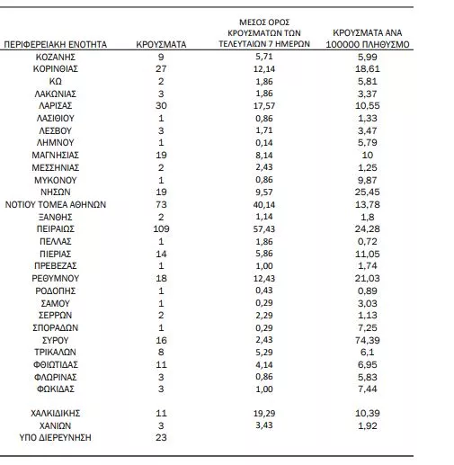 Με βάση τα επιβεβαιωμένα κρούσματα των τελευταίων 7 ημερών, 49 θεωρούνται σχετιζόμενα με ταξίδι από το εξωτερικό και 1.615 είναι σχετιζόμενα με ήδη γνωστό κρούσμα.