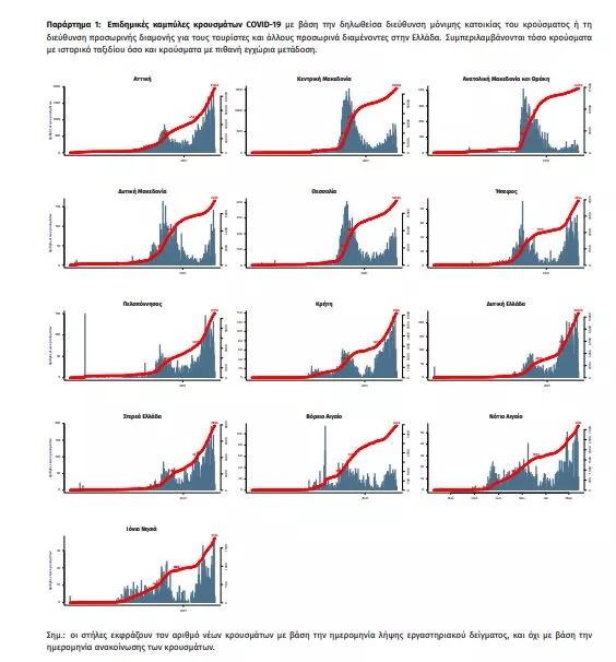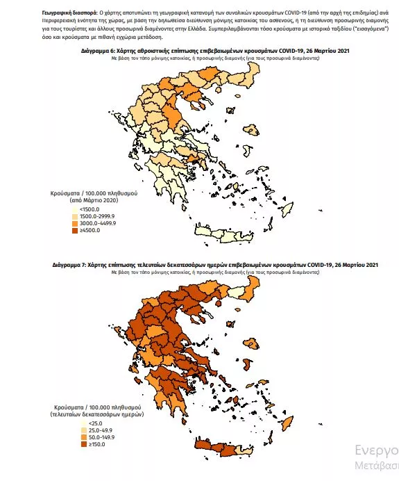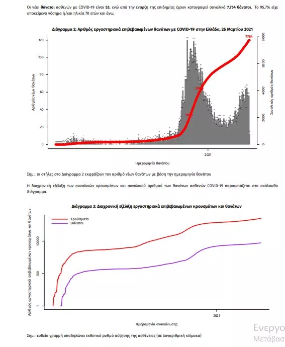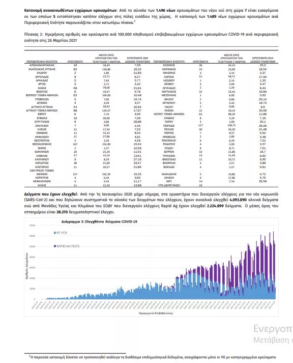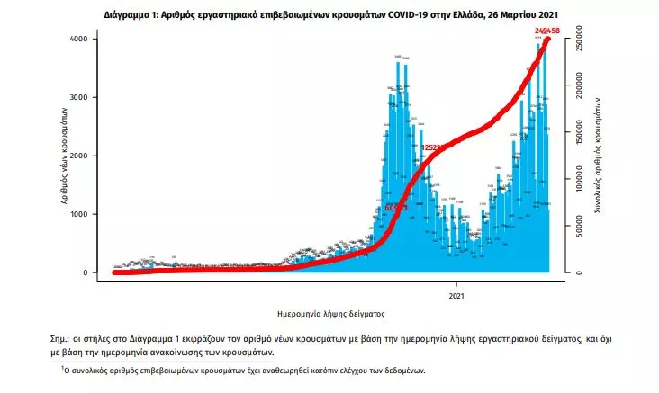 Τα στοιχεία που παρουσιάζονται αφορούν περιστατικά από την επιδημιολογική επιτήρηση της νόσου από το νέο κορωνοϊό (COVID19), με βάση τα δεδομένα που έχουν δηλωθεί στον ΕΟΔΥ και καταγραφεί μέχρι τις 26 Μαρτίου 2021 (ώρα 15:00). Τα νέα εργαστηριακά επιβεβαιωμένα κρούσματα της νόσου που καταγράφηκαν τις τελευταίες 24 ώρες είναι 1.496, εκ των οποίων 5 εντοπίστηκαν κατόπιν ελέγχων στις πύλες εισόδου της χώρας. Ο συνολικός αριθμός των κρουσμάτων ανέρχεται σε 249.458 (ημερήσια μεταβολή +0.6%), εκ των οποίων 51.5% άνδρες. 1 Με βάση τα επιβεβαιωμένα κρούσματα των τελευταίων 7 ημερών, 67 θεωρούνται σχετιζόμενα με ταξίδι από το εξωτερικό και 2.570 είναι σχετιζόμενα με ήδη γνωστό κρούσμα. Ημερήσια εξέλιξη της πανδημίας: Η ημερήσια κατανομή των επιβεβαιωμένων κρουσμάτων είναι η ακόλουθη (η γραμμή παριστάνει την συνολική, αθροιστική κατανομή των κρουσμάτων).