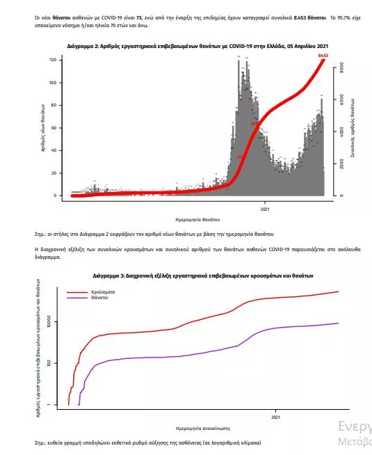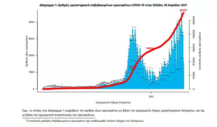 Τα στοιχεία που παρουσιάζονται αφορούν περιστατικά από την επιδημιολογική επιτήρηση της νόσου από το νέο κορωνοϊό (COVID19), με βάση τα δεδομένα που έχουν δηλωθεί στον ΕΟΔΥ και καταγραφεί μέχρι τις 05 Απριλίου 2021 (ώρα 15:00). Τα νέα εργαστηριακά επιβεβαιωμένα κρούσματα της νόσου που καταγράφηκαν τις τελευταίες 24 ώρες είναι 1.866, εκ των οποίων 13 εντοπίστηκαν κατόπιν ελέγχων στις πύλες εισόδου της χώρας. Ο συνολικός αριθμός των κρουσμάτων ανέρχεται σε 277.277 (ημερήσια μεταβολή +0.7%), εκ των οποίων 51.4% άνδρες. 1 Με βάση τα επιβεβαιωμένα κρούσματα των τελευταίων 7 ημερών, 69 θεωρούνται σχετιζόμενα με ταξίδι από το εξωτερικό και 2.935 είναι σχετιζόμενα με ήδη γνωστό κρούσμα. Ημερήσια εξέλιξη της πανδημίας: Η ημερήσια κατανομή των επιβεβαιωμένων κρουσμάτων είναι η ακόλουθη (η γραμμή παριστάνει την συνολική, αθροιστική κατανομή των κρουσμάτων).