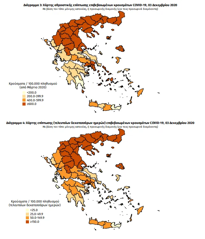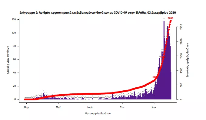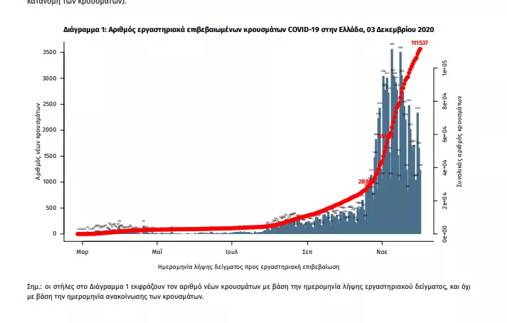 Τα στοιχεία που παρουσιάζονται αφορούν περιστατικά από την επιδημιολογική επιτήρηση της νόσου από το νέο κορωνοϊό (COVID19), με βάση τα δεδομένα που έχουν δηλωθεί στον ΕΟΔΥ και καταγραφεί μέχρι τις 03 Δεκεμβρίου 2020 (ώρα 15:00).Τα νέα εργαστηριακά επιβεβαιωμένα κρούσματα της νόσου είναι 1882, εκ των οποίων 8 εντοπίστηκαν κατόπιν ελέγχων στις πύλες εισόδου της χώρας. Ο συνολικός αριθμός των κρουσμάτων ανέρχεται σε 111537 (ημερήσια μεταβολή +1.7%), εκ των οποίων 52.9% άνδρες. Οι νέοι θάνατοι ασθενών με COVID-19 είναι 100, ενώ από την έναρξη της επιδημίας έχουν καταγραφεί συνολικά 2706 θάνατοι.Η διάμεση ηλικία των ασθενών που απεβίωσαν είναι 80 έτη. Ο αριθμός των ασθενών που νοσηλεύονται διασωληνωμένοι είναι 622 (71.5% άνδρες). Η ημερήσια κατανομή των επιβεβαιωμένων κρουσμάτων είναι η ακόλουθη (η γραμμή παριστάνει την συνολική, αθροιστική κατανομή των κρουσμάτων).