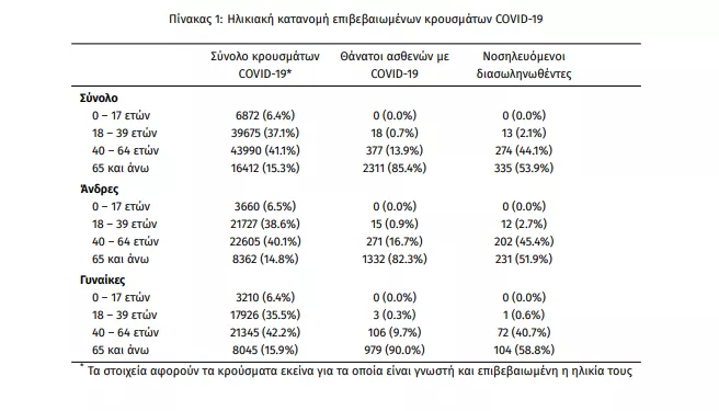 Τέλος, έχουμε 100 ακόμα καταγεγραμμένους θανάτους και 2706 θανάτους συνολικά στη χώρα. 1085 (40.1%) γυναίκες και οι υπόλοιποι άνδρες. Η διάμεση ηλικία των θανόντων συμπολιτών μας ήταν τα 80 έτη και το 96.5% είχε κάποιο υποκείμενο νόσημα ή/και ηλικία 70 ετών και άνω.