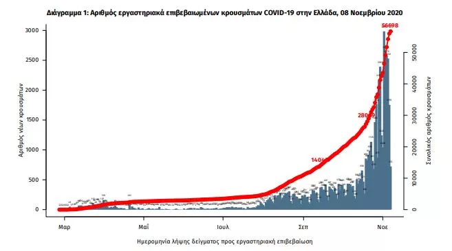 Τα νέα εργαστηριακά επιβεβαιωμένα κρούσματα της νόσου είναι 1914, εκ των οποίων 39 εντοπίστηκαν κατόπιν ελέγχων στις πύλες εισόδου της χώρας. Ο συνολικός αριθμός των κρουσμάτων ανέρχεται σε 56698 (ημερήσια μεταβολή +3.5%), εκ των οποίων 54.2% άνδρες.