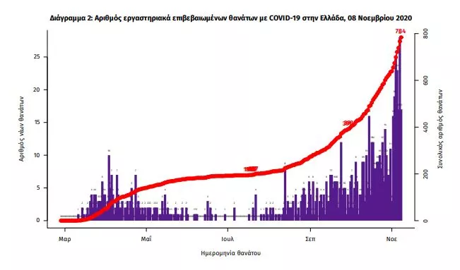 Οι νέοι θάνατοι ασθενών με COVID-19 είναι 35, ενώ από την έναρξη της επιδημίας έχουν καταγραφεί συνολικά 784 θάνατοι.Η διάμεση ηλικία των ασθενών που απεβίωσαν είναι 79 έτη. Ο αριθμός των ασθενών που νοσηλεύονται διασωληνωμένοι είναι 228 (75.0% άνδρες).