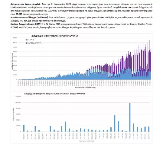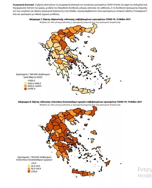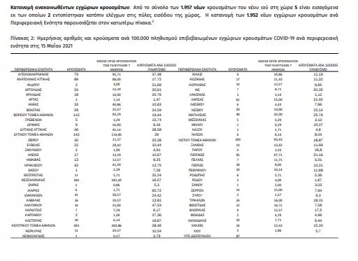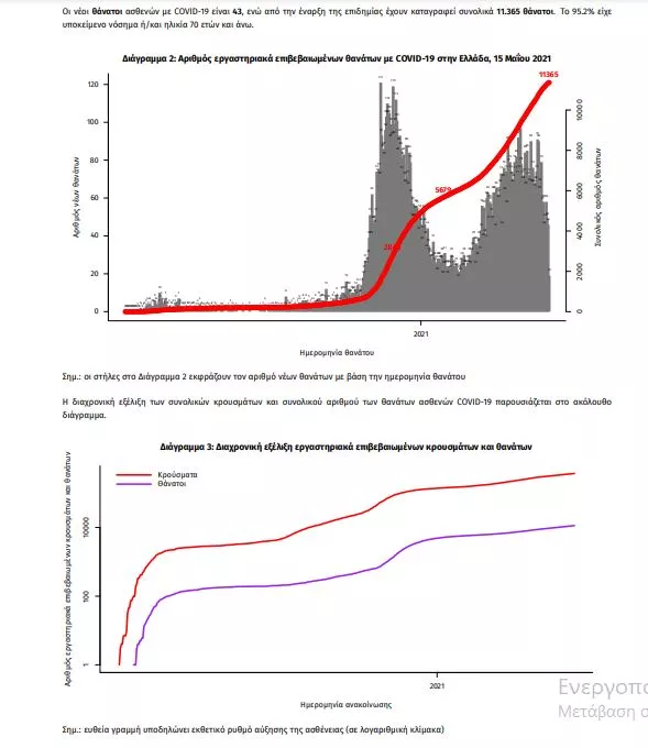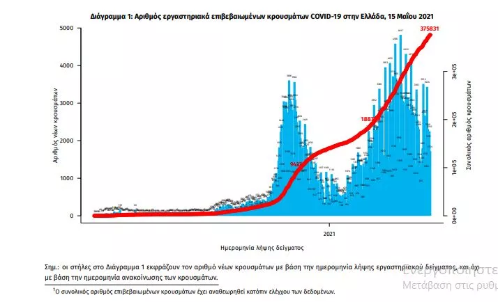 Τα στοιχεία που παρουσιάζονται αφορούν περιστατικά από την επιδημιολογική επιτήρηση της νόσου από το νέο κορωνοϊό (COVID19), με βάση τα δεδομένα που έχουν δηλωθεί στον ΕΟΔΥ και καταγραφεί μέχρι τις 15 Μαΐου 2021 (ώρα 15:00). Τα νέα εργαστηριακά επιβεβαιωμένα κρούσματα της νόσου που καταγράφηκαν τις τελευταίες 24 ώρες είναι 1.957, εκ των οποίων 2 εντοπίστηκαν κατόπιν ελέγχων στις πύλες εισόδου της χώρας. Ο συνολικός αριθμός των κρουσμάτων ανέρχεται σε 375.831 (ημερήσια μεταβολή +0.5%), εκ των οποίων 51.2% άνδρες. 1 Με βάση τα επιβεβαιωμένα κρούσματα των τελευταίων 7 ημερών, 49 θεωρούνται σχετιζόμενα με ταξίδι από το εξωτερικό και 2.677 είναι σχετιζόμενα με ήδη γνωστό κρούσμα. Ημερήσια εξέλιξη της πανδημίας: Η ημερήσια κατανομή των επιβεβαιωμένων κρουσμάτων είναι η ακόλουθη (η γραμμή παριστάνει την συνολική, αθροιστική κατανομή των κρουσμάτων).