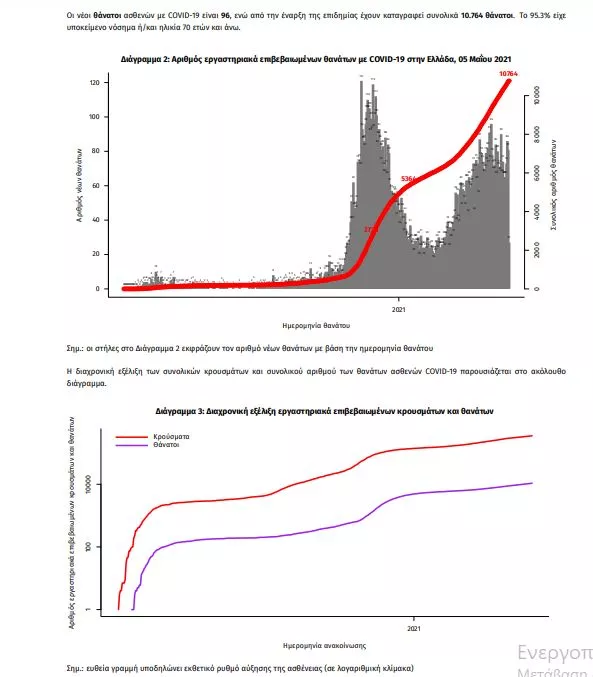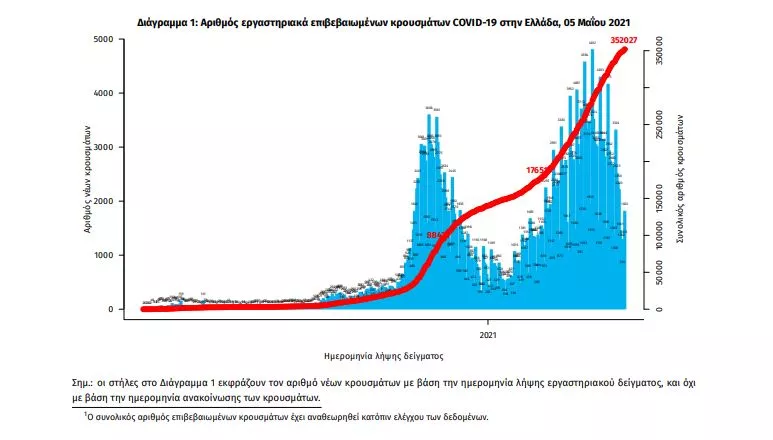 Τα στοιχεία που παρουσιάζονται αφορούν περιστατικά από την επιδημιολογική επιτήρηση της νόσου από το νέο κορωνοϊό (COVID19), με βάση τα δεδομένα που έχουν δηλωθεί στον ΕΟΔΥ και καταγραφεί μέχρι τις 05 Μαΐου 2021 (ώρα 15:00). Τα νέα εργαστηριακά επιβεβαιωμένα κρούσματα της νόσου που καταγράφηκαν τις τελευταίες 24 ώρες είναι 2.093, εκ των οποίων 6 εντοπίστηκαν κατόπιν ελέγχων στις πύλες εισόδου της χώρας. Ο συνολικός αριθμός των κρουσμάτων ανέρχεται σε 352.027 (ημερήσια μεταβολή +0.6%), εκ των οποίων 51.3% άνδρες. 1 Με βάση τα επιβεβαιωμένα κρούσματα των τελευταίων 7 ημερών, 44 θεωρούνται σχετιζόμενα με ταξίδι από το εξωτερικό και 865 είναι σχετιζόμενα με ήδη γνωστό κρούσμα. To 𝑅𝑡 για την επικράτεια εκτιμάται σε 0.96 (95%Crl: 0.37 - 1.43) Ημερήσια εξέλιξη της πανδημίας: Η ημερήσια κατανομή των επιβεβαιωμένων κρουσμάτων είναι η ακόλουθη (η γραμμή παριστάνει την συνολική, αθροιστική κατανομή των κρουσμάτων).